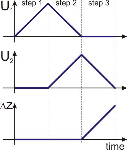 This figure shows the voltage pattern applied to both piezo tubes and the resulting motion of the central tube during one cycle as function of time. One single cycle can induce a motion in the range between 100nm up to 5 μm which is ideally suited for coarse approach in scanning probe microscopy. A long stroke, only limited by the length of the tube, and speeds up to 1 mm/s are possible. Most other nanopositioners used for tip-sample approach in scanning probe microscopy use the inertial motion with saw-tooth like signals inducing large accelerations causing vibrations in the system. The operation mode of the KoalaDrive® is quasi static (one cycle can even last several seconds) avoiding large accelerations which lead to a continuous motion without shaking. Avoiding steep slope signals means also less demands for the power supply (no high slew rate needed) and for the cabling (no high currents flow).