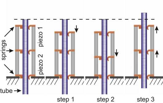One cycle of motion of the KoalaDrive® is shown in this figure. In step 1 of the cycle the upper piezo element contracts and the upper spring goes into sliding friction. The central tube is held stationary by the lower two springs which stay in static friction with the tube. Subsequently, in step 2 the middle spring is moving downwards while the upper and the lower spring stay at their positions. For the upper spring this is realized by a simultaneous contraction of the lower piezo element and a corresponding expansion of the upper one, leaving the upper spring unmoved. Also here a single spring (middle one) is moving, while the other two ones hold the tube fixed. Finally, in step 3 the lower piezo extends and moves the two upper springs up simultaneously. In this case the lower spring goes into sliding friction and the upper two springs move the tube up (static friction). Simplified, the working principle follows the rule: "Two are stronger than one". If two springs move simultaneously, the central tube moves with them. If only one spring moves, the tube is hold stationary by the other two.