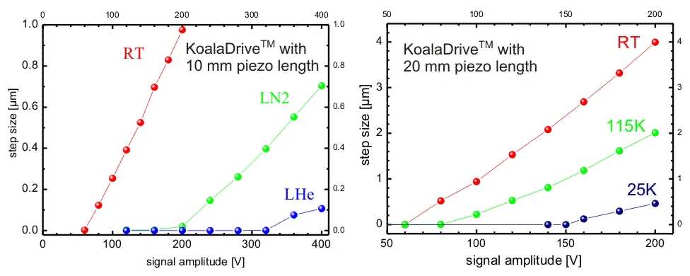 KoalaDrive® performance: single step displacement as function of signal amplitude. The data are shown for a 20 mm long and for a 10 mm long KoalaDrive®. The motion of the tube induced by a single cycle (step) as function of the amplitude of the excitation voltage shown. Starting from low amplitudes, there is a threshold voltage above which the motion of the KoalaDrive® starts. For lower voltages the extension of the piezo tubes results in a build up of stress in the system, but only beyond the threshold voltage a transition to sliding friction occurs. For amplitudes larger than this threshold voltage the single step displacement increases linearly with the signal voltage. Due to the smaller piezo constant at low temperatures, the threshold and the slope of the curves decreases for operation at low temperatures. This shows that the KoalaDrive® works at cryogenic temperatures (down to liquid helium temperatures).